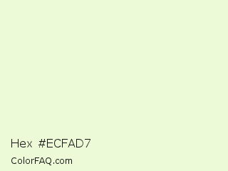 Hex #ecfad7 Color is a very light green color and the nearest color is Nyanza #e9ffdb. Hex code #ecfad7 and RGB value is rgb(236,250,215). In RGB color space, this color is composed of 93% red, 98% green, 84% blue, In CMYK color space, this color is composed of 6% cyan, 0% magenta, 14% yellow , 2% black , In HSL color space, this color has a hue angle of 84° , 78% saturation and 91% lightness.