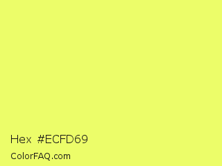 Hex #ecfd69 Color is a light yellow color and the nearest color is Canary #f3fb62. Hex code #ecfd69 and RGB value is rgb(236,253,105). In RGB color space, this color is composed of 93% red, 99% green, 41% blue, In CMYK color space, this color is composed of 7% cyan, 0% magenta, 58% yellow , 1% black , In HSL color space, this color has a hue angle of 67° , 97% saturation and 70% lightness.
