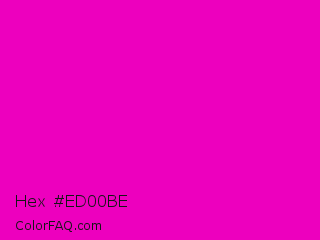 Hex #ed00be Color is a normal magenta color and the nearest color is Shocking Pink #fc0fc0. Hex code #ed00be and RGB value is rgb(237,0,190). In RGB color space, this color is composed of 93% red, 0% green, 75% blue, In CMYK color space, this color is composed of 0% cyan, 100% magenta, 20% yellow , 7% black , In HSL color space, this color has a hue angle of 312° , 100% saturation and 46% lightness.