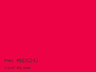 Hex #ed0245 Color is a normal rose color and the nearest color is Red Ribbon #ed0a3f. Hex code #ed0245 and RGB value is rgb(237,2,69). In RGB color space, this color is composed of 93% red, 1% green, 27% blue, In CMYK color space, this color is composed of 0% cyan, 99% magenta, 71% yellow , 7% black , In HSL color space, this color has a hue angle of 343° , 98% saturation and 47% lightness.