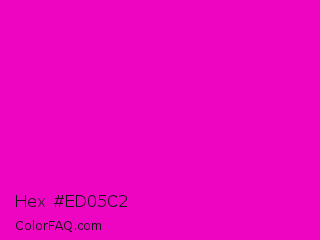 Hex #ed05c2 Color is a normal magenta color and the nearest color is Shocking Pink #fc0fc0. Hex code #ed05c2 and RGB value is rgb(237,5,194). In RGB color space, this color is composed of 93% red, 2% green, 76% blue, In CMYK color space, this color is composed of 0% cyan, 98% magenta, 18% yellow , 7% black , In HSL color space, this color has a hue angle of 311° , 96% saturation and 47% lightness.