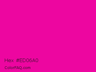 Hex #ed06a0 Color is a normal magenta color and the nearest color is Hollywood Cerise #f400a1. Hex code #ed06a0 and RGB value is rgb(237,6,160). In RGB color space, this color is composed of 93% red, 2% green, 63% blue, In CMYK color space, this color is composed of 0% cyan, 97% magenta, 32% yellow , 7% black , In HSL color space, this color has a hue angle of 320° , 95% saturation and 48% lightness.