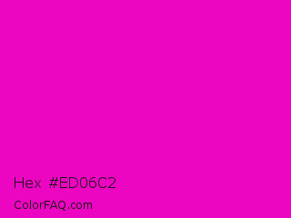 Hex #ed06c2 Color is a normal magenta color and the nearest color is Shocking Pink #fc0fc0. Hex code #ed06c2 and RGB value is rgb(237,6,194). In RGB color space, this color is composed of 93% red, 2% green, 76% blue, In CMYK color space, this color is composed of 0% cyan, 97% magenta, 18% yellow , 7% black , In HSL color space, this color has a hue angle of 311° , 95% saturation and 48% lightness.