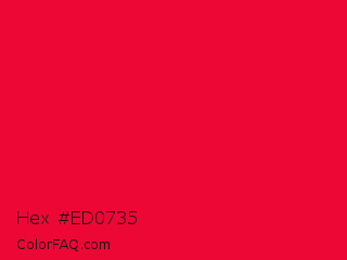 Hex #ed0735 Color is a normal red color and the nearest color is Red Ribbon #ed0a3f. Hex code #ed0735 and RGB value is rgb(237,7,53). In RGB color space, this color is composed of 93% red, 3% green, 21% blue, In CMYK color space, this color is composed of 0% cyan, 97% magenta, 78% yellow , 7% black , In HSL color space, this color has a hue angle of 348° , 94% saturation and 48% lightness.