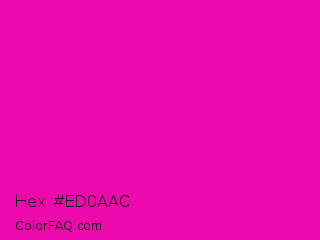 Hex #ed0aac Color is a normal magenta color and the nearest color is Hollywood Cerise #f400a1. Hex code #ed0aac and RGB value is rgb(237,10,172). In RGB color space, this color is composed of 93% red, 4% green, 67% blue, In CMYK color space, this color is composed of 0% cyan, 96% magenta, 27% yellow , 7% black , In HSL color space, this color has a hue angle of 317° , 92% saturation and 48% lightness.