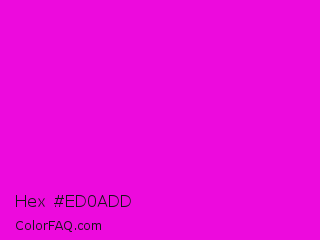Hex #ed0add Color is a normal magenta color and the nearest color is Purple Pizzazz #ff00cc. Hex code #ed0add and RGB value is rgb(237,10,221). In RGB color space, this color is composed of 93% red, 4% green, 87% blue, In CMYK color space, this color is composed of 0% cyan, 96% magenta, 7% yellow , 7% black , In HSL color space, this color has a hue angle of 304° , 92% saturation and 48% lightness.