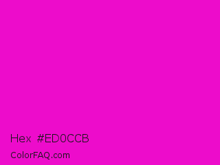 Hex #ed0ccb Color is a normal magenta color and the nearest color is Shocking Pink #fc0fc0. Hex code #ed0ccb and RGB value is rgb(237,12,203). In RGB color space, this color is composed of 93% red, 5% green, 80% blue, In CMYK color space, this color is composed of 0% cyan, 95% magenta, 14% yellow , 7% black , In HSL color space, this color has a hue angle of 309° , 90% saturation and 49% lightness.