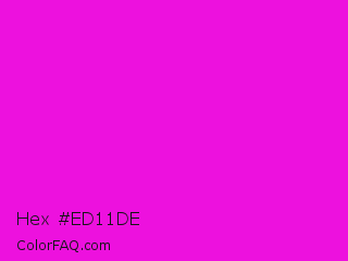 Hex #ed11de Color is a normal magenta color and the nearest color is Hot Magenta #ff1dce. Hex code #ed11de and RGB value is rgb(237,17,222). In RGB color space, this color is composed of 93% red, 7% green, 87% blue, In CMYK color space, this color is composed of 0% cyan, 93% magenta, 6% yellow , 7% black , In HSL color space, this color has a hue angle of 304° , 87% saturation and 50% lightness.
