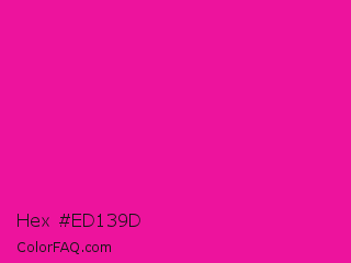 Hex #ed139d Color is a normal magenta color and the nearest color is Fluorescent Pink #ff1493. Hex code #ed139d and RGB value is rgb(237,19,157). In RGB color space, this color is composed of 93% red, 7% green, 62% blue, In CMYK color space, this color is composed of 0% cyan, 92% magenta, 34% yellow , 7% black , In HSL color space, this color has a hue angle of 322° , 86% saturation and 50% lightness.