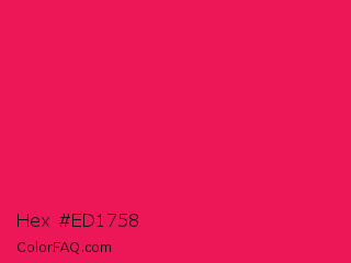 Hex #ed1758 Color is a normal rose color and the nearest color is Red Crayola #ee204d. Hex code #ed1758 and RGB value is rgb(237,23,88). In RGB color space, this color is composed of 93% red, 9% green, 35% blue, In CMYK color space, this color is composed of 0% cyan, 90% magenta, 63% yellow , 7% black , In HSL color space, this color has a hue angle of 342° , 86% saturation and 51% lightness.