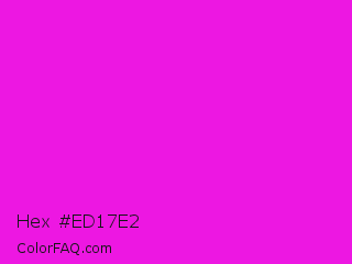 Hex #ed17e2 Color is a normal magenta color and the nearest color is Hot Magenta #ff1dce. Hex code #ed17e2 and RGB value is rgb(237,23,226). In RGB color space, this color is composed of 93% red, 9% green, 89% blue, In CMYK color space, this color is composed of 0% cyan, 90% magenta, 5% yellow , 7% black , In HSL color space, this color has a hue angle of 303° , 86% saturation and 51% lightness.
