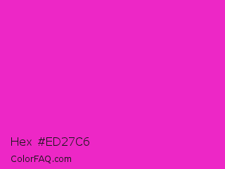 Hex #ed27c6 Color is a normal magenta color and the nearest color is Hot Magenta #ff1dce. Hex code #ed27c6 and RGB value is rgb(237,39,198). In RGB color space, this color is composed of 93% red, 15% green, 78% blue, In CMYK color space, this color is composed of 0% cyan, 84% magenta, 16% yellow , 7% black , In HSL color space, this color has a hue angle of 312° , 85% saturation and 54% lightness.