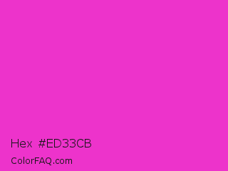 Hex #ed33cb Color is a normal magenta color and the nearest color is Razzle Dazzle Rose #ff33cc. Hex code #ed33cb and RGB value is rgb(237,51,203). In RGB color space, this color is composed of 93% red, 20% green, 80% blue, In CMYK color space, this color is composed of 0% cyan, 78% magenta, 14% yellow , 7% black , In HSL color space, this color has a hue angle of 311° , 84% saturation and 56% lightness.