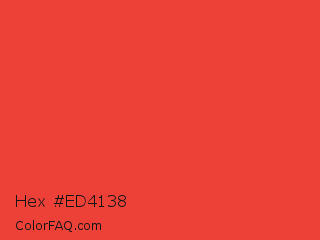 Hex #ed4138 Color is a normal red color and the nearest color is Cinnabar #e34234. Hex code #ed4138 and RGB value is rgb(237,65,56). In RGB color space, this color is composed of 93% red, 25% green, 22% blue, In CMYK color space, this color is composed of 0% cyan, 73% magenta, 76% yellow , 7% black , In HSL color space, this color has a hue angle of 3° , 83% saturation and 57% lightness.