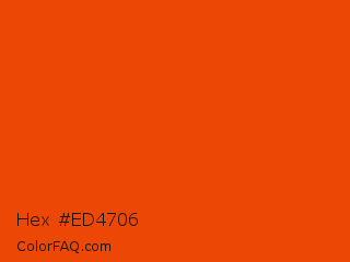 Hex #ed4706 Color is a normal orange color and the nearest color is Trinidad #e64e03. Hex code #ed4706 and RGB value is rgb(237,71,6). In RGB color space, this color is composed of 93% red, 28% green, 2% blue, In CMYK color space, this color is composed of 0% cyan, 70% magenta, 97% yellow , 7% black , In HSL color space, this color has a hue angle of 17° , 95% saturation and 48% lightness.
