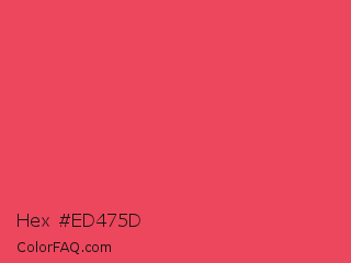 Hex #ed475d Color is a normal red color and the nearest color is Paradise Pink #e63e62. Hex code #ed475d and RGB value is rgb(237,71,93). In RGB color space, this color is composed of 93% red, 28% green, 36% blue, In CMYK color space, this color is composed of 0% cyan, 70% magenta, 61% yellow , 7% black , In HSL color space, this color has a hue angle of 352° , 82% saturation and 60% lightness.