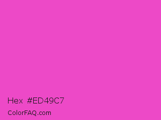 Hex #ed49c7 Color is a light magenta color and the nearest color is Purple Pizzazz #fe4eda. Hex code #ed49c7 and RGB value is rgb(237,73,199). In RGB color space, this color is composed of 93% red, 29% green, 78% blue, In CMYK color space, this color is composed of 0% cyan, 69% magenta, 16% yellow , 7% black , In HSL color space, this color has a hue angle of 314° , 82% saturation and 61% lightness.