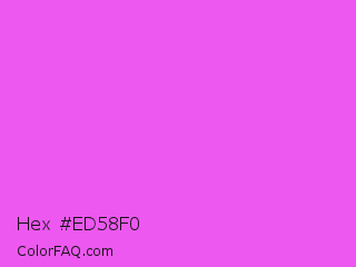 Hex #ed58f0 Color is a light magenta color and the nearest color is Pink Flamingo Crayola #ff66ff. Hex code #ed58f0 and RGB value is rgb(237,88,240). In RGB color space, this color is composed of 93% red, 35% green, 94% blue, In CMYK color space, this color is composed of 1% cyan, 63% magenta, 0% yellow , 6% black , In HSL color space, this color has a hue angle of 299° , 84% saturation and 64% lightness.