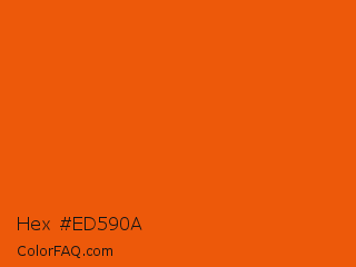 Hex #ed590a Color is a normal orange color and the nearest color is Persimmon #ec5800. Hex code #ed590a and RGB value is rgb(237,89,10). In RGB color space, this color is composed of 93% red, 35% green, 4% blue, In CMYK color space, this color is composed of 0% cyan, 62% magenta, 96% yellow , 7% black , In HSL color space, this color has a hue angle of 21° , 92% saturation and 48% lightness.