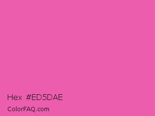 Hex #ed5dae Color is a light magenta color and the nearest color is Brilliant Rose #f653a6. Hex code #ed5dae and RGB value is rgb(237,93,174). In RGB color space, this color is composed of 93% red, 36% green, 68% blue, In CMYK color space, this color is composed of 0% cyan, 61% magenta, 27% yellow , 7% black , In HSL color space, this color has a hue angle of 326° , 80% saturation and 65% lightness.