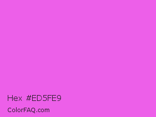 Hex #ed5fe9 Color is a light magenta color and the nearest color is Purple Pizzazz #fe4eda. Hex code #ed5fe9 and RGB value is rgb(237,95,233). In RGB color space, this color is composed of 93% red, 37% green, 91% blue, In CMYK color space, this color is composed of 0% cyan, 60% magenta, 2% yellow , 7% black , In HSL color space, this color has a hue angle of 302° , 80% saturation and 65% lightness.