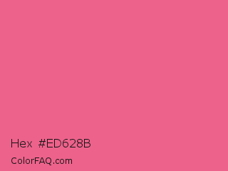 Hex #ed628b Color is a light rose color and the nearest color is Light Crimson #f56991. Hex code #ed628b and RGB value is rgb(237,98,139). In RGB color space, this color is composed of 93% red, 38% green, 55% blue, In CMYK color space, this color is composed of 0% cyan, 59% magenta, 41% yellow , 7% black , In HSL color space, this color has a hue angle of 342° , 79% saturation and 66% lightness.