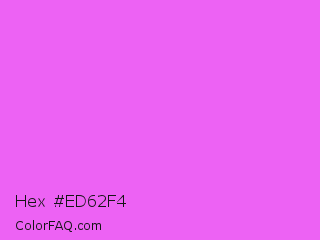 Hex #ed62f4 Color is a light magenta color and the nearest color is Pink Flamingo Crayola #ff66ff. Hex code #ed62f4 and RGB value is rgb(237,98,244). In RGB color space, this color is composed of 93% red, 38% green, 96% blue, In CMYK color space, this color is composed of 3% cyan, 60% magenta, 0% yellow , 4% black , In HSL color space, this color has a hue angle of 297° , 87% saturation and 67% lightness.