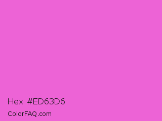 Hex #ed63d6 Color is a light magenta color and the nearest color is Rose Pink #ff66cc. Hex code #ed63d6 and RGB value is rgb(237,99,214). In RGB color space, this color is composed of 93% red, 39% green, 84% blue, In CMYK color space, this color is composed of 0% cyan, 58% magenta, 10% yellow , 7% black , In HSL color space, this color has a hue angle of 310° , 79% saturation and 66% lightness.
