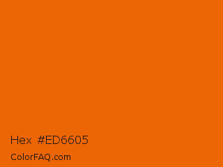 Hex #ed6605 Color is a normal orange color and the nearest color is Spanish Orange #e86100. Hex code #ed6605 and RGB value is rgb(237,102,5). In RGB color space, this color is composed of 93% red, 40% green, 2% blue, In CMYK color space, this color is composed of 0% cyan, 57% magenta, 98% yellow , 7% black , In HSL color space, this color has a hue angle of 25° , 96% saturation and 47% lightness.