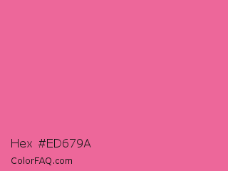 Hex #ed679a Color is a light rose color and the nearest color is Light Crimson #f56991. Hex code #ed679a and RGB value is rgb(237,103,154). In RGB color space, this color is composed of 93% red, 40% green, 60% blue, In CMYK color space, this color is composed of 0% cyan, 57% magenta, 35% yellow , 7% black , In HSL color space, this color has a hue angle of 337° , 79% saturation and 67% lightness.