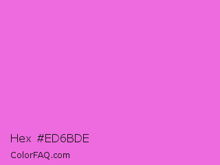 Hex #ed6bde Color is a light magenta color and the nearest color is Orchid #da70d6. Hex code #ed6bde and RGB value is rgb(237,107,222). In RGB color space, this color is composed of 93% red, 42% green, 87% blue, In CMYK color space, this color is composed of 0% cyan, 55% magenta, 6% yellow , 7% black , In HSL color space, this color has a hue angle of 307° , 78% saturation and 67% lightness.