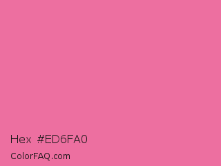 Hex #ed6fa0 Color is a light rose color and the nearest color is Cyclamen #f56fa1. Hex code #ed6fa0 and RGB value is rgb(237,111,160). In RGB color space, this color is composed of 93% red, 44% green, 63% blue, In CMYK color space, this color is composed of 0% cyan, 53% magenta, 32% yellow , 7% black , In HSL color space, this color has a hue angle of 337° , 78% saturation and 68% lightness.