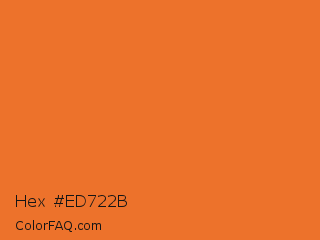 Hex #ed722b Color is a normal orange color and the nearest color is Vivid Tangelo #f07427. Hex code #ed722b and RGB value is rgb(237,114,43). In RGB color space, this color is composed of 93% red, 45% green, 17% blue, In CMYK color space, this color is composed of 0% cyan, 52% magenta, 82% yellow , 7% black , In HSL color space, this color has a hue angle of 22° , 84% saturation and 55% lightness.