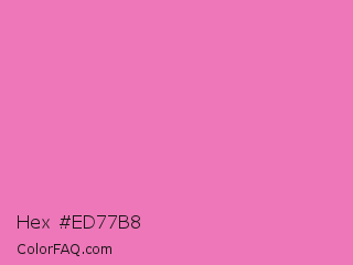 Hex #ed77b8 Color is a light magenta color and the nearest color is Persian Pink #f77fbe. Hex code #ed77b8 and RGB value is rgb(237,119,184). In RGB color space, this color is composed of 93% red, 47% green, 72% blue, In CMYK color space, this color is composed of 0% cyan, 50% magenta, 22% yellow , 7% black , In HSL color space, this color has a hue angle of 327° , 77% saturation and 70% lightness.