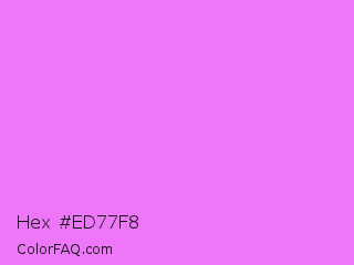 Hex #ed77f8 Color is a light magenta color and the nearest color is Lavender Magenta #ee82ee. Hex code #ed77f8 and RGB value is rgb(237,119,248). In RGB color space, this color is composed of 93% red, 47% green, 97% blue, In CMYK color space, this color is composed of 4% cyan, 52% magenta, 0% yellow , 3% black , In HSL color space, this color has a hue angle of 295° , 90% saturation and 72% lightness.