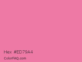 Hex #ed79a4 Color is a light rose color and the nearest color is Cyclamen #f56fa1. Hex code #ed79a4 and RGB value is rgb(237,121,164). In RGB color space, this color is composed of 93% red, 47% green, 64% blue, In CMYK color space, this color is composed of 0% cyan, 49% magenta, 31% yellow , 7% black , In HSL color space, this color has a hue angle of 338° , 76% saturation and 70% lightness.