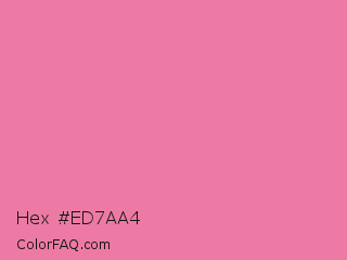 Hex #ed7aa4 Color is a light rose color and the nearest color is Cyclamen #f56fa1. Hex code #ed7aa4 and RGB value is rgb(237,122,164). In RGB color space, this color is composed of 93% red, 48% green, 64% blue, In CMYK color space, this color is composed of 0% cyan, 49% magenta, 31% yellow , 7% black , In HSL color space, this color has a hue angle of 338° , 76% saturation and 70% lightness.