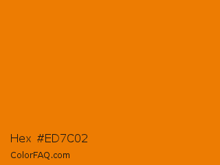 Hex #ed7c02 Color is a normal orange color and the nearest color is Tahiti Gold #e97c07. Hex code #ed7c02 and RGB value is rgb(237,124,2). In RGB color space, this color is composed of 93% red, 49% green, 1% blue, In CMYK color space, this color is composed of 0% cyan, 48% magenta, 99% yellow , 7% black , In HSL color space, this color has a hue angle of 31° , 98% saturation and 47% lightness.