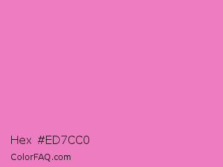 Hex #ed7cc0 Color is a light magenta color and the nearest color is Persian Pink #f77fbe. Hex code #ed7cc0 and RGB value is rgb(237,124,192). In RGB color space, this color is composed of 93% red, 49% green, 75% blue, In CMYK color space, this color is composed of 0% cyan, 48% magenta, 19% yellow , 7% black , In HSL color space, this color has a hue angle of 324° , 76% saturation and 71% lightness.