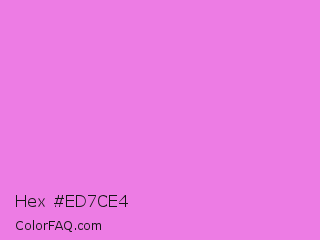 Hex #ed7ce4 Color is a light magenta color and the nearest color is Lavender Magenta #ee82ee. Hex code #ed7ce4 and RGB value is rgb(237,124,228). In RGB color space, this color is composed of 93% red, 49% green, 89% blue, In CMYK color space, this color is composed of 0% cyan, 48% magenta, 4% yellow , 7% black , In HSL color space, this color has a hue angle of 305° , 76% saturation and 71% lightness.