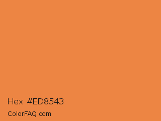 Hex #ed8543 Color is a normal orange color and the nearest color is Jaffa #ef863f. Hex code #ed8543 and RGB value is rgb(237,133,67). In RGB color space, this color is composed of 93% red, 52% green, 26% blue, In CMYK color space, this color is composed of 0% cyan, 44% magenta, 72% yellow , 7% black , In HSL color space, this color has a hue angle of 23° , 83% saturation and 60% lightness.