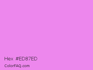 Hex #ed87ed Color is a light magenta color and the nearest color is Lavender Magenta #ee82ee. Hex code #ed87ed and RGB value is rgb(237,135,237). In RGB color space, this color is composed of 93% red, 53% green, 93% blue, In CMYK color space, this color is composed of 0% cyan, 43% magenta, 0% yellow , 7% black , In HSL color space, this color has a hue angle of 300° , 74% saturation and 73% lightness.
