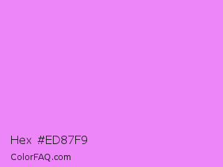 Hex #ed87f9 Color is a light magenta color and the nearest color is Lavender Magenta #ee82ee. Hex code #ed87f9 and RGB value is rgb(237,135,249). In RGB color space, this color is composed of 93% red, 53% green, 98% blue, In CMYK color space, this color is composed of 5% cyan, 46% magenta, 0% yellow , 2% black , In HSL color space, this color has a hue angle of 294° , 90% saturation and 75% lightness.