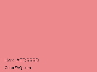 Hex #ed888d Color is a light red color and the nearest color is Geraldine #fb8989. Hex code #ed888d and RGB value is rgb(237,136,141). In RGB color space, this color is composed of 93% red, 53% green, 55% blue, In CMYK color space, this color is composed of 0% cyan, 43% magenta, 41% yellow , 7% black , In HSL color space, this color has a hue angle of 357° , 74% saturation and 73% lightness.