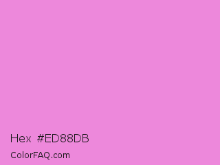 Hex #ed88db Color is a light magenta color and the nearest color is Pale Magenta #f984e5. Hex code #ed88db and RGB value is rgb(237,136,219). In RGB color space, this color is composed of 93% red, 53% green, 86% blue, In CMYK color space, this color is composed of 0% cyan, 43% magenta, 8% yellow , 7% black , In HSL color space, this color has a hue angle of 311° , 74% saturation and 73% lightness.