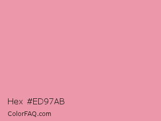 Hex #ed97ab Color is a light red color and the nearest color is Mauvelous #ef98aa. Hex code #ed97ab and RGB value is rgb(237,151,171). In RGB color space, this color is composed of 93% red, 59% green, 67% blue, In CMYK color space, this color is composed of 0% cyan, 36% magenta, 28% yellow , 7% black , In HSL color space, this color has a hue angle of 346° , 70% saturation and 76% lightness.