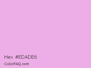 Hex #edade6 Color is a light magenta color and the nearest color is Light Orchid #e6a8d7. Hex code #edade6 and RGB value is rgb(237,173,230). In RGB color space, this color is composed of 93% red, 68% green, 90% blue, In CMYK color space, this color is composed of 0% cyan, 27% magenta, 3% yellow , 7% black , In HSL color space, this color has a hue angle of 307° , 64% saturation and 80% lightness.