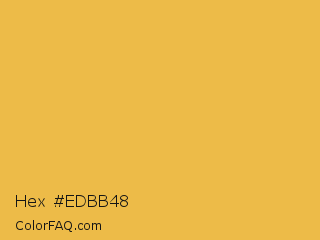 Hex #edbb48 Color is a light orange color and the nearest color is Maximum Yellow Red #f2ba49. Hex code #edbb48 and RGB value is rgb(237,187,72). In RGB color space, this color is composed of 93% red, 73% green, 28% blue, In CMYK color space, this color is composed of 0% cyan, 21% magenta, 70% yellow , 7% black , In HSL color space, this color has a hue angle of 42° , 82% saturation and 61% lightness.
