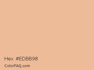 Hex #edbb98 Color is a light orange color and the nearest color is Calico #e0c095. Hex code #edbb98 and RGB value is rgb(237,187,152). In RGB color space, this color is composed of 93% red, 73% green, 60% blue, In CMYK color space, this color is composed of 0% cyan, 21% magenta, 36% yellow , 7% black , In HSL color space, this color has a hue angle of 25° , 70% saturation and 76% lightness.