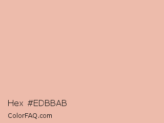 Hex #edbbab Color is a light color and the nearest color is Zinnwaldite #ebc2af. Hex code #edbbab and RGB value is rgb(237,187,171). In RGB color space, this color is composed of 93% red, 73% green, 67% blue, In CMYK color space, this color is composed of 0% cyan, 21% magenta, 28% yellow , 7% black , In HSL color space, this color has a hue angle of 15° , 65% saturation and 80% lightness.
